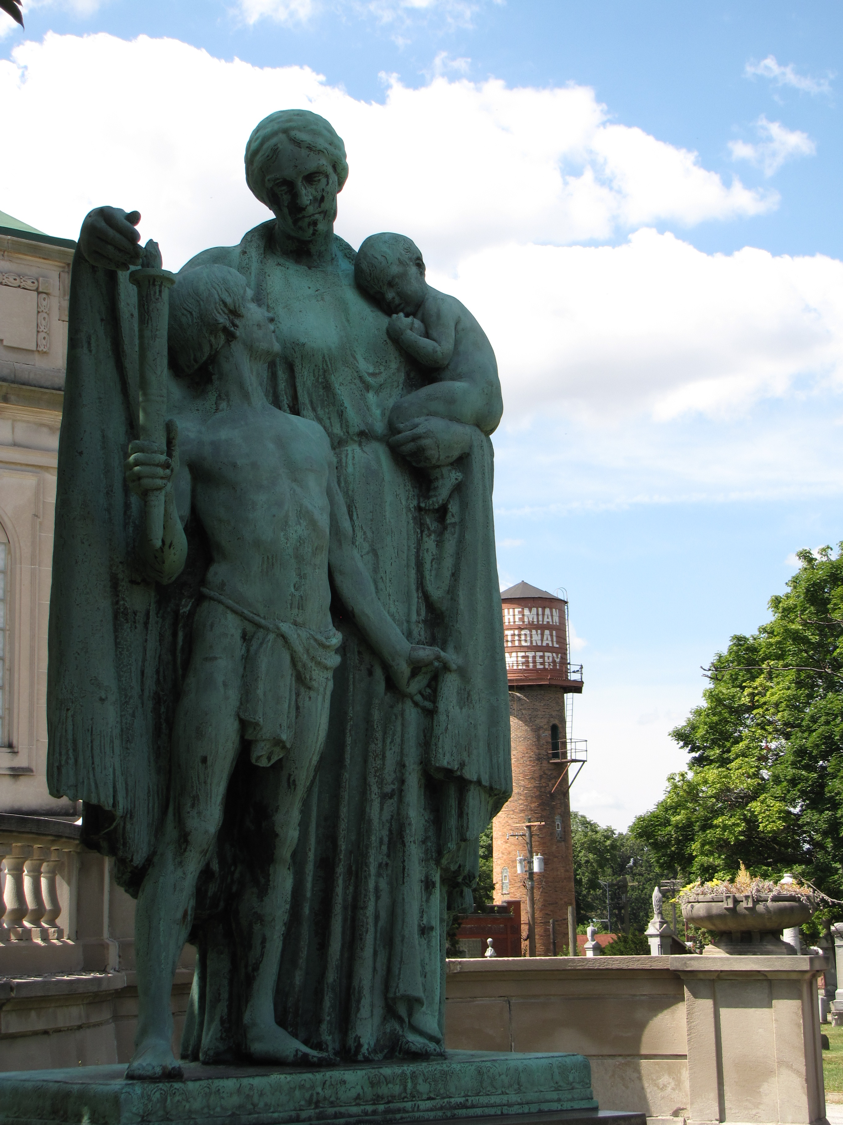 Many large urban cemeteries have not only incredible pieces of sculpture as memorials but have other commissioned works of art to commemorate important dates in the history of the graveyard. Two such sculptures were commissioned for the Bohemian National Cemetery at Chicago, Illinois, by the famed Czech-American sculptor, Albin Polasek (February 14, 1879 – May 19, 1965). Polasek was a prolific artist who created hundreds of works during his famed career.