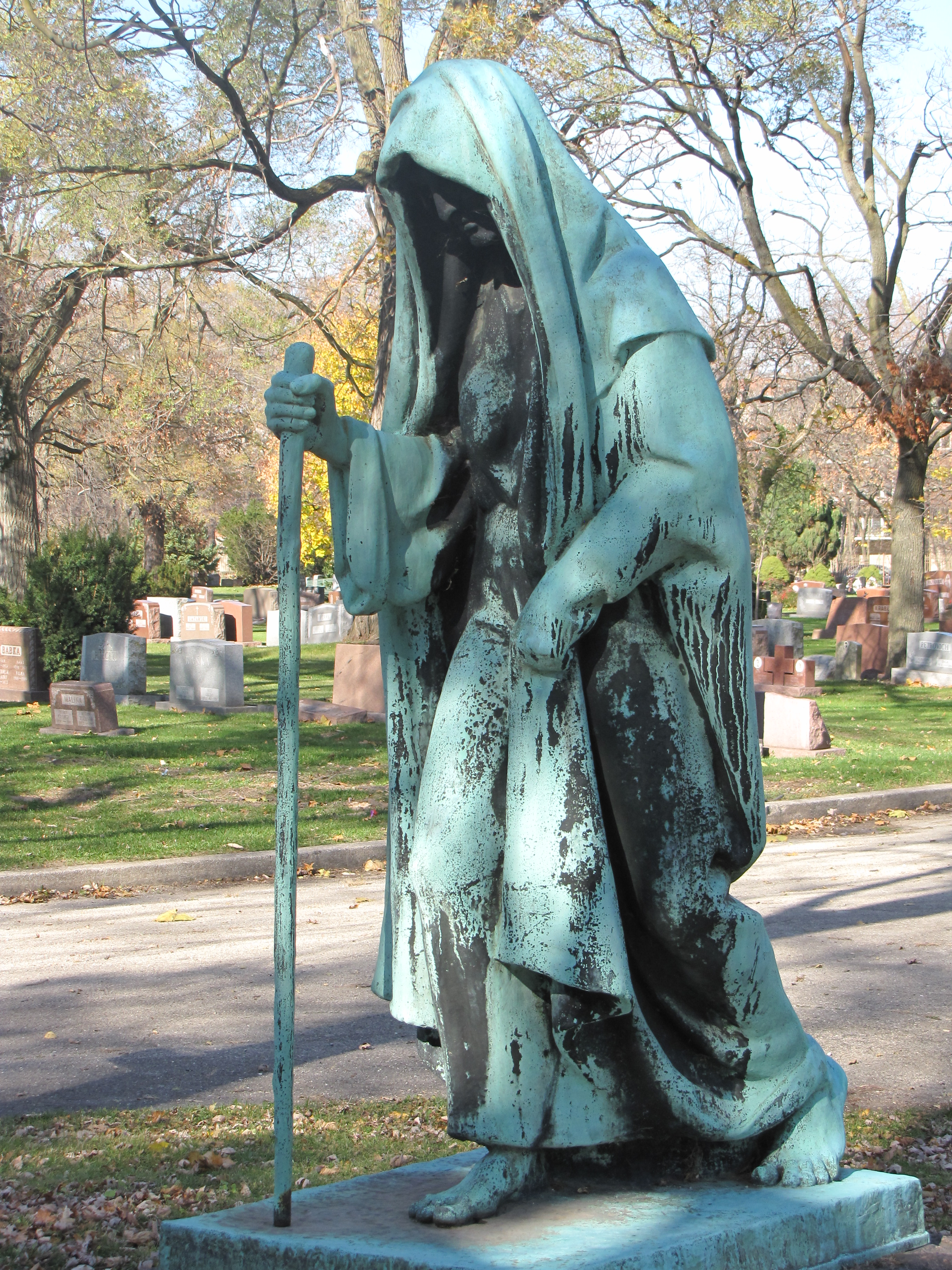 The cloaked and hooded figure titled, The Pilgrim, has been mistaken for the grim reaper—sallow, gaunt, and walking with a stick toward the mausoleum door—a haunting visage.