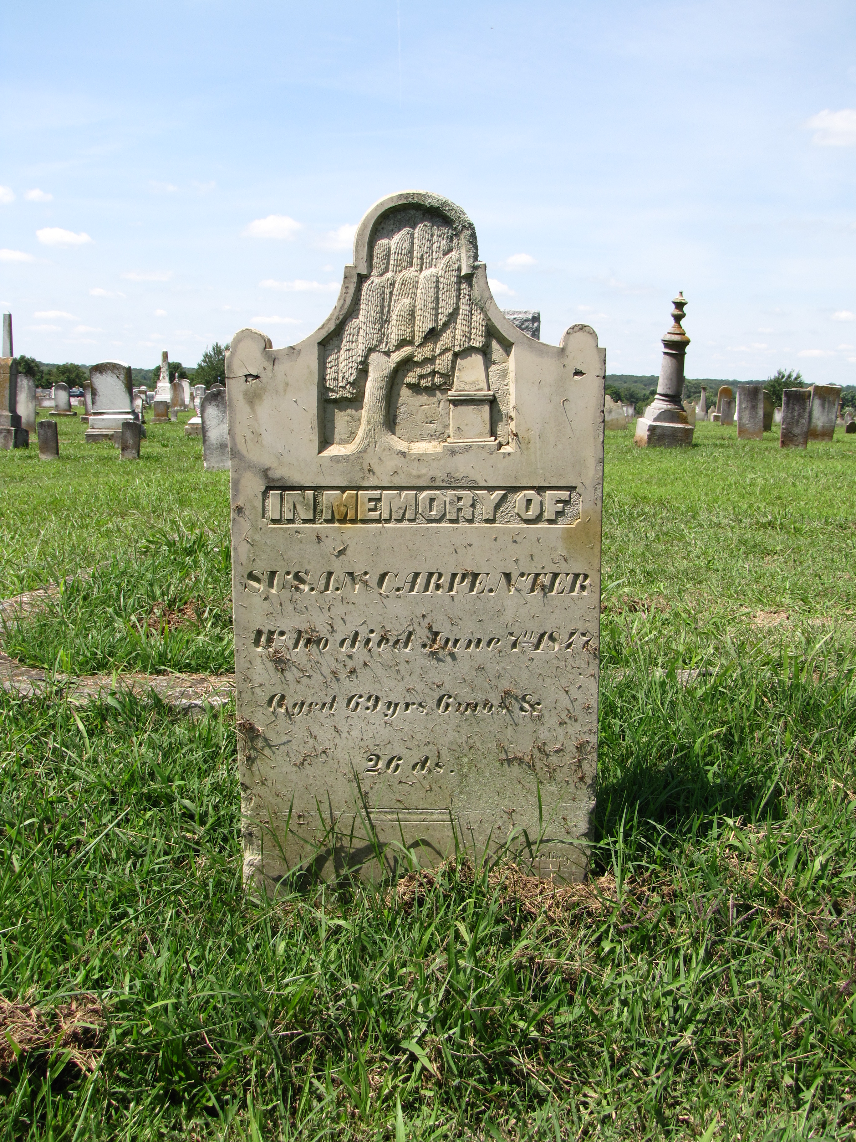 In the Crown Hill Cemetery at Salem, Indiana, there are good many intricately carved limestone gravestones, such as, the one created for Susan Carpenter in 1847. In the top third of her tombstone is a detailed carving of a weeping willow tree that hangs over and obscures part of an obelisk. The carving is fresh and sharp and looks like it could have been carved that day.  The obelisk is a stone shape that is ubiquitous in American cemeteries and part of the Egyptian Revival Period which was inspired by the French and then the British presence in Egypt in the late 18th and early 19th Centuries. The obelisk is said to represent a single ray of sunlight, petrified from sunlight into stone.  It was thought that the Egyptian sung god Ra lived within the obelisks.  These towering monuments were often placed flanking the entrance to temples.