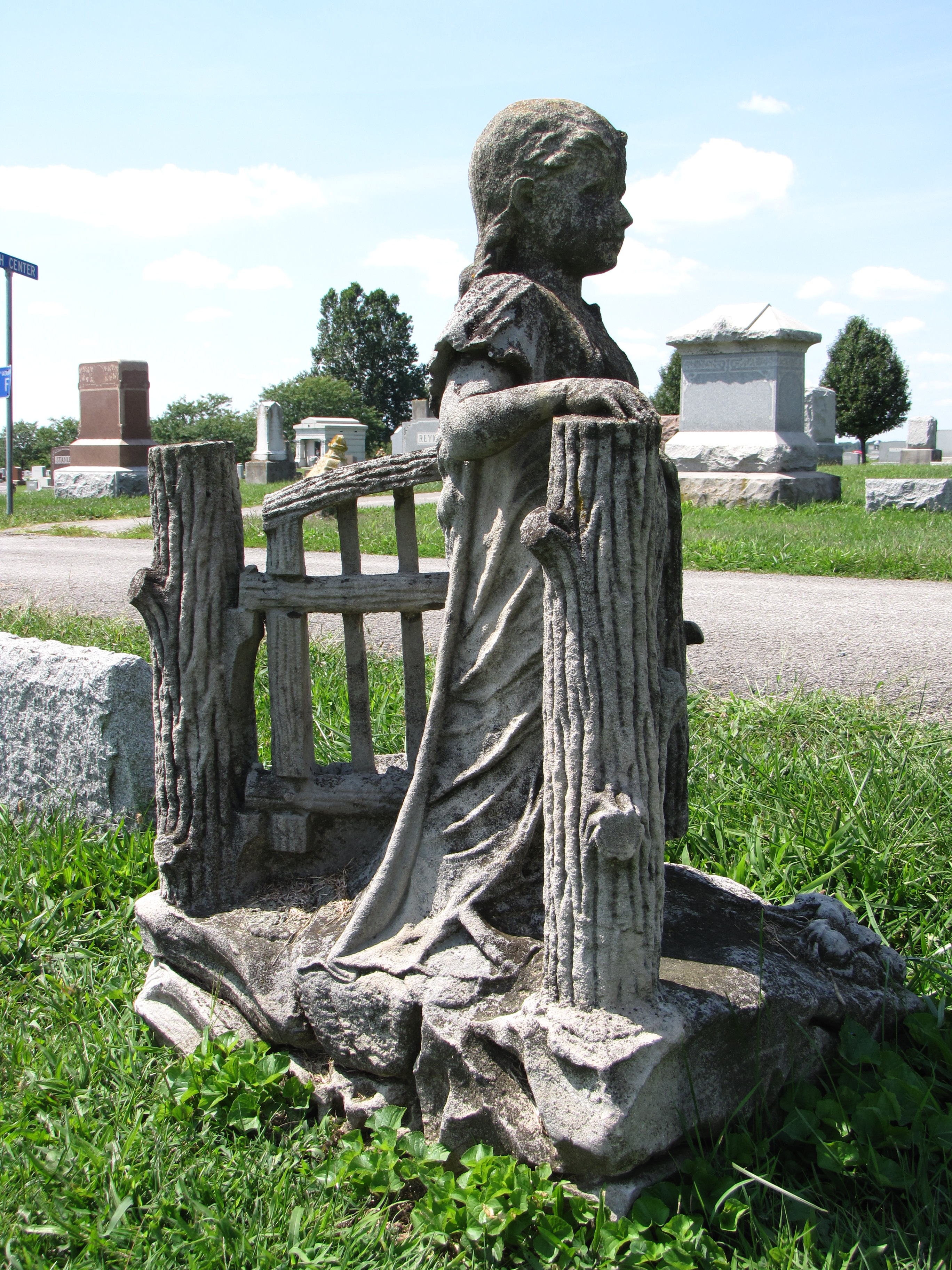 According to all reports he loved his craft and was widely recognized for his talent. But, according to Guardians of the Soul, a book about cemetery sculptures in Indiana by John Bower, one of his greatest joys was at the end of the day when he was met by his four-year old daughter, Caddy, at their garden gate. Tragedy struck when illness befell the little girl and she died a few days later. John Naugle was bereft and unable concentrate at his job and many projects were left undone. According to Bower’s book, “many of his duties were taken over by an itinerant stone mason who just happened to be passing through town.”