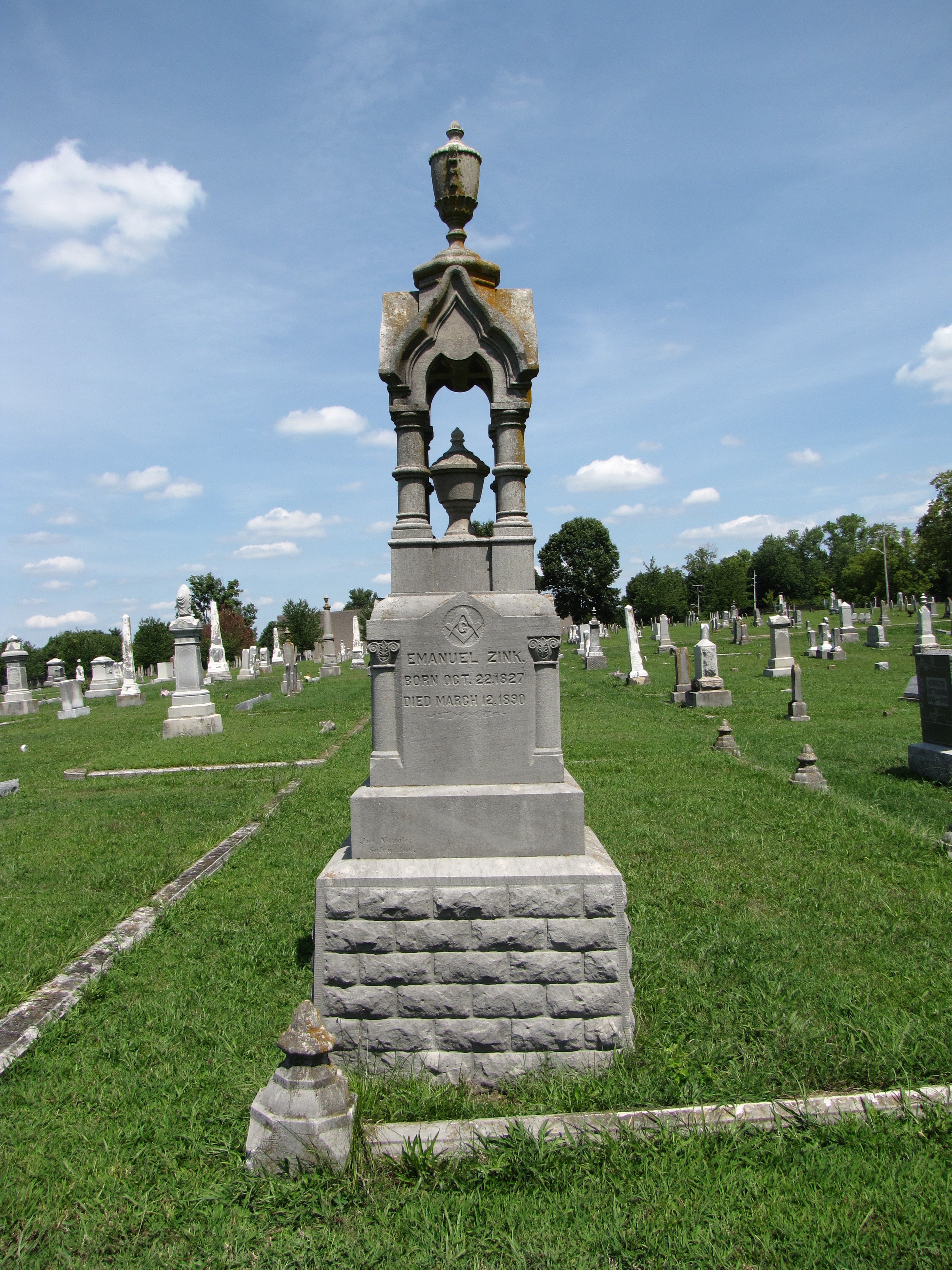 John Naugle was a master carver who plied his trade in the Salem, Indiana, area. Examples of his work can be found in the Crown Hill Cemetery of Salem. Two examples, the Lula McMahan monument and the Emmanuel Zink Monument, demonstrate his talent as a carver. In these examples shown here, Naugle crafted towering monuments that are architectural in nature. They resemble each other in form, but have minor changes in detail and symbolism.