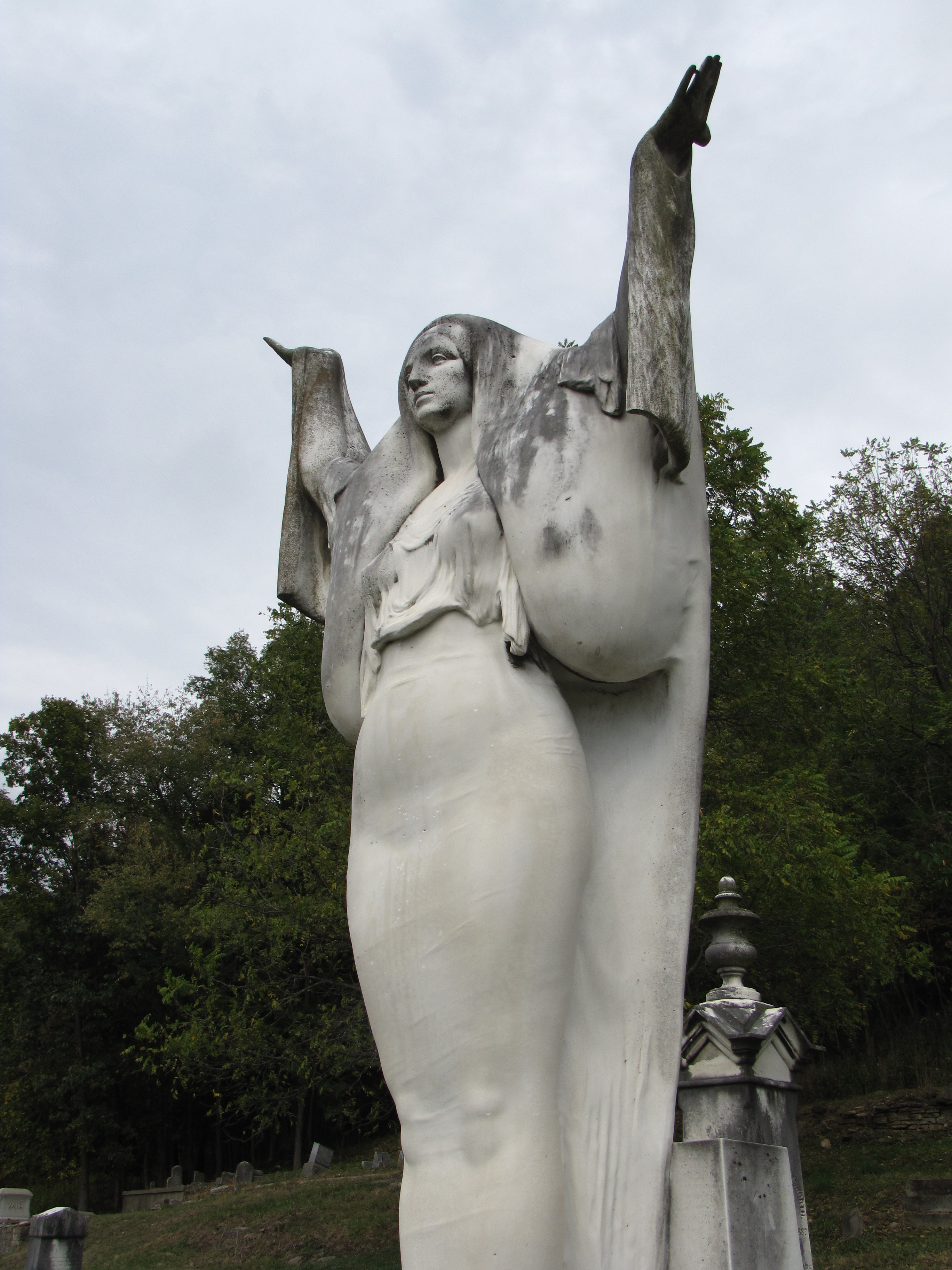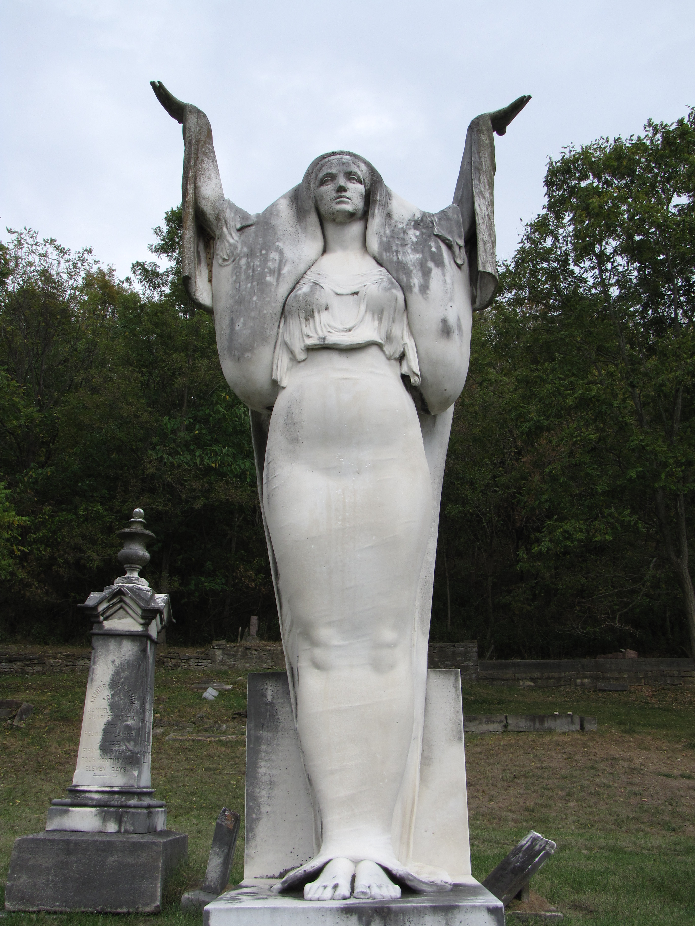 Some sources say the statue was titled, “Let There Be Light” while John Bower’s book, Guardians of the Soul, a book about cemetery sculptures in Indiana, say it was titled “Immortality.” According to the book Barnard’s masterful sculpture was described as “an incomparably beautiful figure of a woman in the matching loveliness of mature perfection and form…the lovely hands are uplifted, parting the veil that encircles the voiceless silence of dreamless dust.”