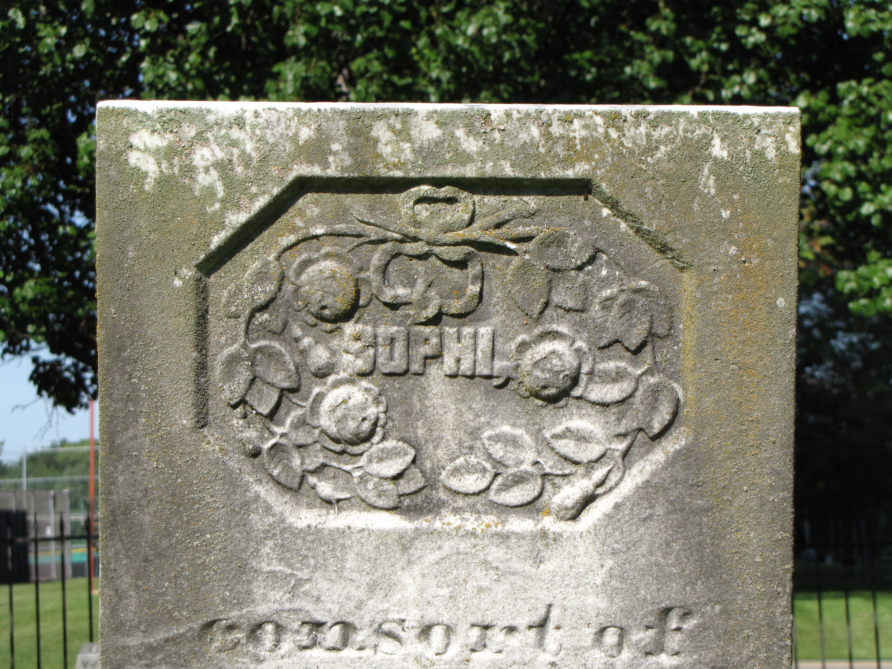 Romantics have waxed poetic about the rose and the connection to love for centuries which has made the rose an undeniable symbol of love. On this gravestone, James Edgar, expresses his love for his wife, Sophi, who only lived 13 days past her 27th birthday with the rose symbolism in the octagon-shaped recess at the top of the soft white marble gravestone. The two sprigs of roses are tied together with a bow encircling Sophi’s name. Each fully-blossomed rose is accompanied by a rosebud perhaps symbolic of a woman old enough to be married but still so young.