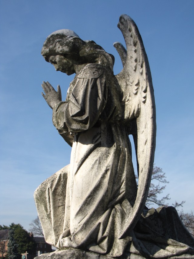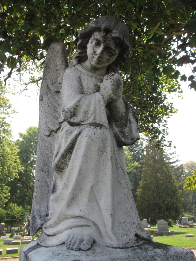 Elisabeth L. Roark wrote an article about angels titled, “Embodying Immortality: Angels in America’s Rural Garden Cemeteries, 1850—1900”, pages 56 – 111, 2007 edition of Markers, XXIV, in which she categorized the eight most commonly found types of graveyard angels—grouped the task they performed: soul-bearing; praying; decorating and guarding; pointing; recording; trumpeting; sword-bearing (archangel Michael); and child angels.