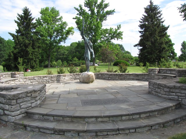 The rural garden Spring Grove Cemetery at Cincinnati, Ohio, has a sculpture by artist Robert Koepnick of Dayton, Ohio, dedicated to Johnny Appleseed. The sculpture, dedicated in 1968, is placed in the middle of a stone circle with Johnny in the middle standing on a granite boulder. The bronze is of a barefoot Johnny Appleseed, book in one hand, the other lifting up an apple sprig—presumably towards the heavens asking for God’s blessings before it was planted.