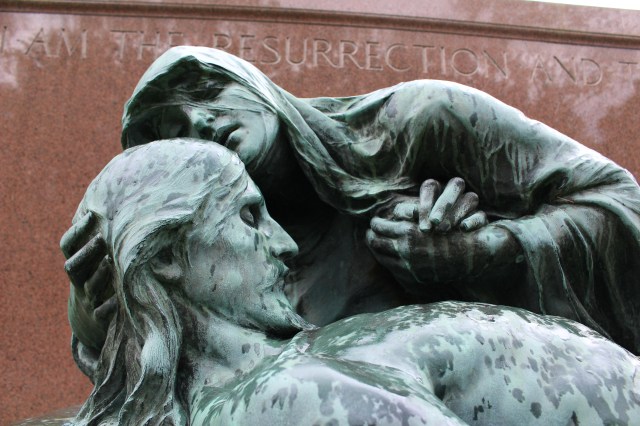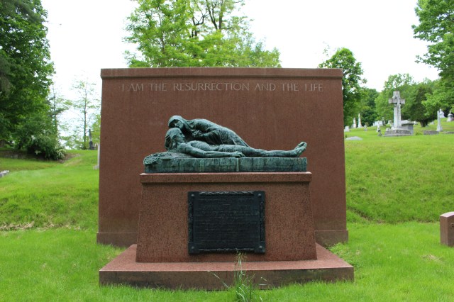 The Hubbard family monument in the Green Mount Cemetery at Montpelier, Vermont, features a bronze sculpture of the Virgin Mary cradling the head of Jesus Christ on top of a highly-polished red granite monument. Sculptures depicting Marry with the dead body of Jesus are known as a pieta statue. This sculpture on the Hubbard Family Monument was created by French artist J. Perrin in 1908 and cast at the R. Barbedienne Foundry at Paris.