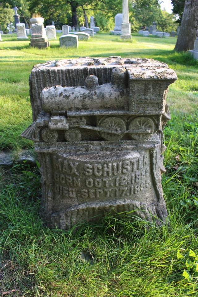 In funerary art, tombstones took on the look of tree stumps. The gravestones were purposefully designed to look like trees that had been cut and left in the cemetery to mark a grave. Most of these tree-stump tombstones were carved from limestone, which is easier to carve, though some are made from marble and even a few from granite. The creativity of the carvers were boundless. Thousands of tree-stump tombstones exist in nearly as many designs. Stonecutters displayed a wide variety of design, including this tree-stump design with a sculpture of a locomotive carved into the side of the stump. According to Silent City: A History of Forest Home Cemetery by John Gurda and published by the cemetery itself, the gravestone with the artful train engine is a nod the Max Schuster’s career as a rail road engineer.