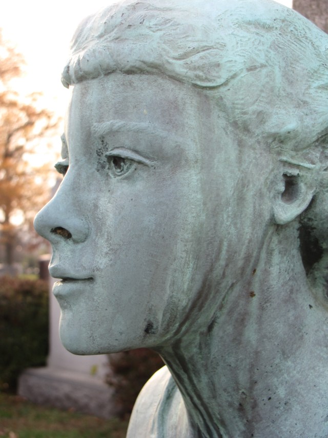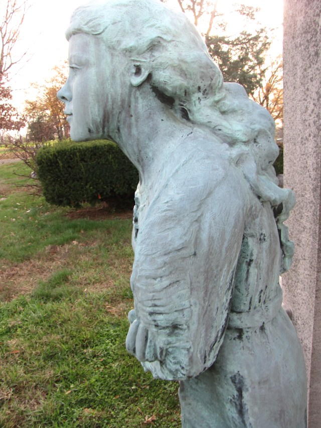 The Appleby Family Monument features a bronze sculpture standing in front of a stone arched alcove. The diminutive woman is leaning forward as if she is taking a step forward. Two symbols are apparent in the statute—an ankh and a palm. She wears a necklace that has an ankh and holds a palm frond. Both symbols have religious meaning. The palm is a symbol of spiritual victory. The palm was the plant that was laid on Christ’s path as he entered Jerusalem. It became a symbol of martyrdom and resurrection. In the Middle Ages people wore the palm to signify pilgrimage. The ankh is an Egyptian symbol of eternal life.