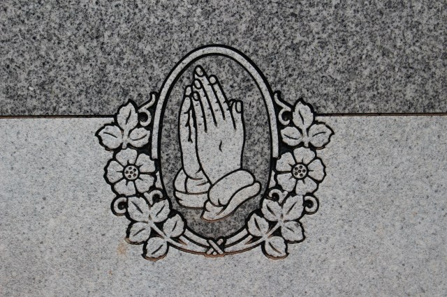 Praying hands, which can be found as incised carvings on gravestones or as statues that form a centerpiece in gardens within cemeteries, are a symbol of pious devotion. Praying hands also symbolize the hope for an eternal life.