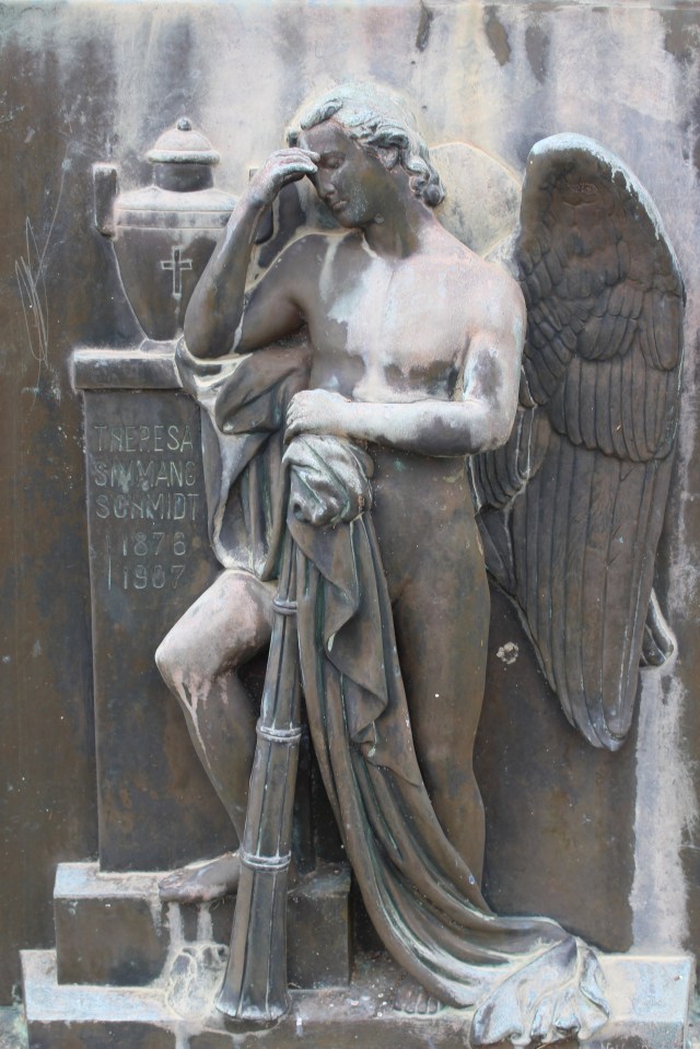 The gray granite rock-face monument for Theresa Schmidt in the St. John’s Lutheran Cemetery in San Antonio, Texas, has a masterfully sculpted bas-relief bronze inset. The bronze was created in Fonderia Nelli, one of the top foundries in Rome, Italy, producing works by famous European sculptors during the late 19th Century and early 20th Century. The foundry also produced works for Tiffany & Company in New York. This particular neo-classical sculpture features a contemplative male angel. His head is slightly bent leaning against his hand. His other hand rests on top of an inverted torch which represents a life that has been extinguished.