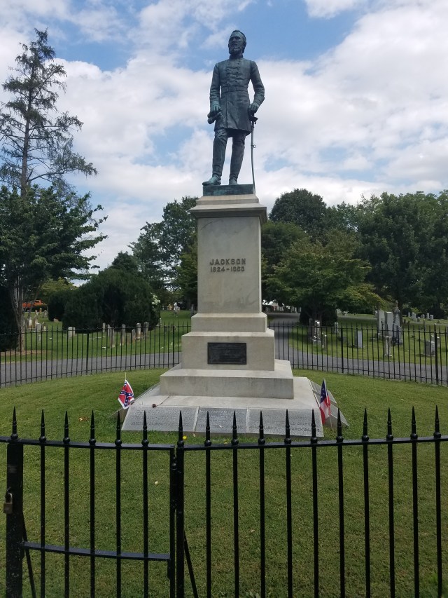 Jackson was removed to Guinea Station where he died on May 10 of infection and pneumonia. His remains were buried in a family plot in the Presbyterian Cemetery in Lexington, which was later renamed for him. Though his white-marble gravestone still remains in its original place in the family plot, his remains were removed along with other family members to repose underneath the statue erected in his honor. Though Jackson was reunited with his family members under the great statue, he was not reunited with his left arm which rests miles away in a cemetery on Ellwood Manor.