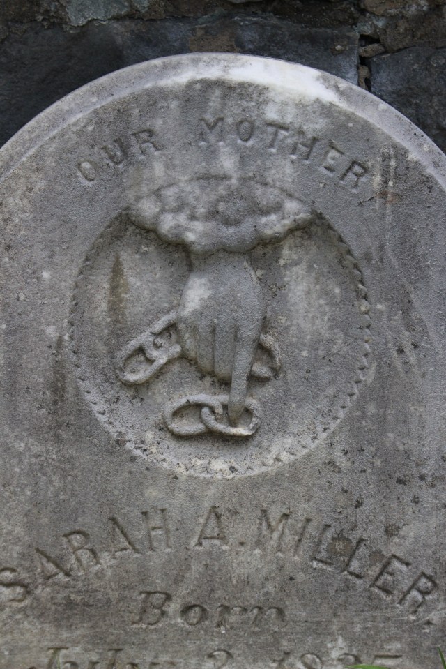 The rounded-top white marble tablet in the Stonewall Jackson Memorial Cemetery, in Lexington, Virginia, of Sarah A. Miller has turned gray as it has weathered. The bas-relief sculpture in the top of the gravestone depicts the hand of God holding a broken chain. The broken link of chain represents a life that has ended. This symbolism dates back to medieval times when people believed that the soul could be held to the body by a golden chain. Once the chain was broken, the soul took flight and rose from the body leaving Earth and ascended to Heaven.