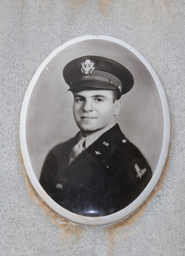 Carved into the marble in bas-relief on the gravestone’s flanks are shields each with a Latin cross, symbolizing the Christian faith. Also on the cenotaph are the Army Air Force Flight Engineer’s Wing and the B-29 Superfortress in which he flew those heroic missions.