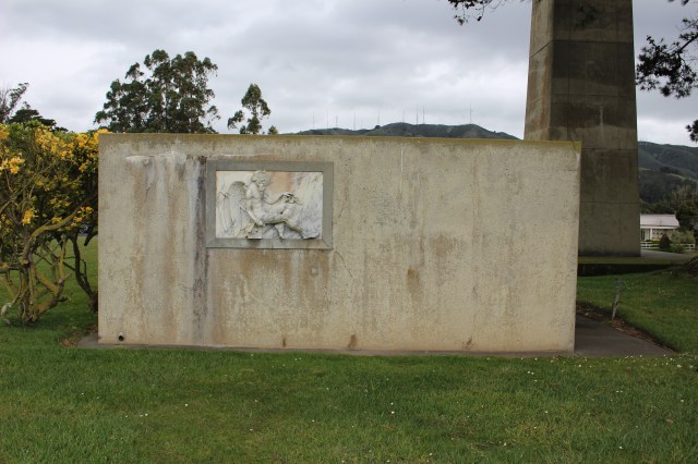 On the opposite side of the monolith, is a three-quarter sculpture of the grim reaper characterized by a long beard and a scythe.  The scythe is his tool for cutting down and harvesting souls.  In this sculpture the Grim Reaper is depicted as a thin bearded old man with wings.  A winged hour glass rests on his knee.