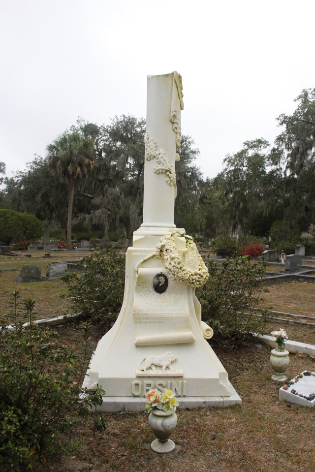 According to Historic Bonaventure Cemetery: Photographs from the Collection of The Georgia Historical Society,  “Sabastian Orsini (1873-1918) was also an Italian immigrant.  He came to Savannah around 1898 and along with several brothers was involved in the grocery business.  From 1912 to 1915, the Savannah City Directory listed him as proprietor of the Savannah Macaroni Works.”