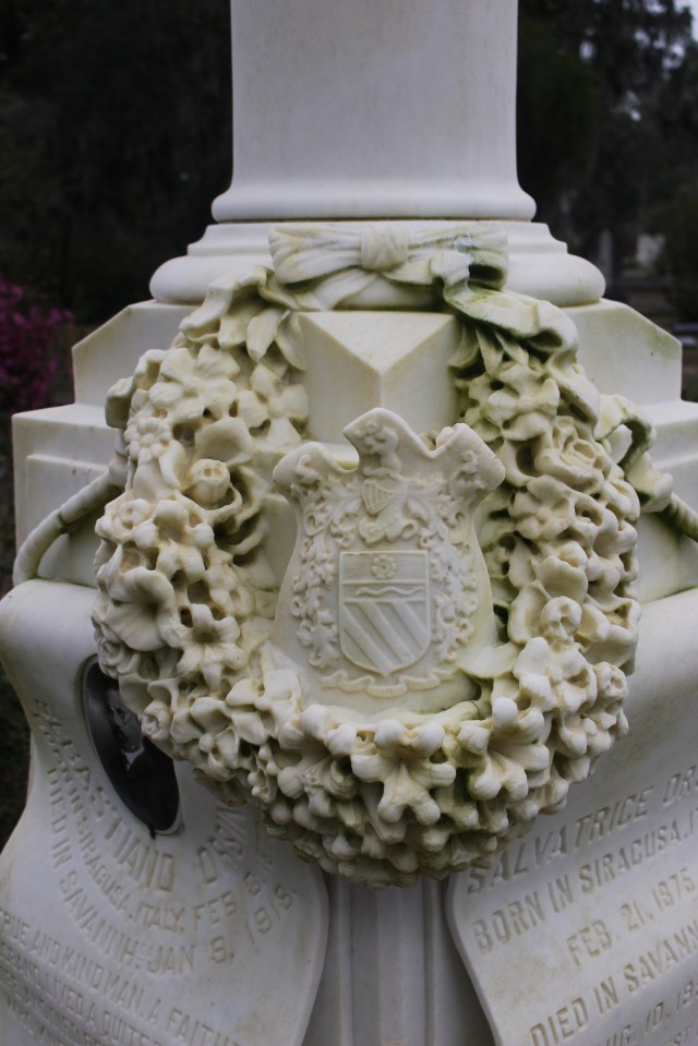 The white marble gravestone of Sebastiano and Salvatrice Orsini in the Bonaventure Cemetery in Savannah, Georgia, is a Victorian mélange of symbolism—the family crest, the wreath, the scrolls, oak leaves circling the column, drapery, and the lion. The gravestone shape itself—the broken column—is a symbol.   The broken column iconography represents a life ended.  The broken column symbolizes a life cut short. Some sources say that it represents the loss of the head of the family—others that it represents the life cut down in its prime.