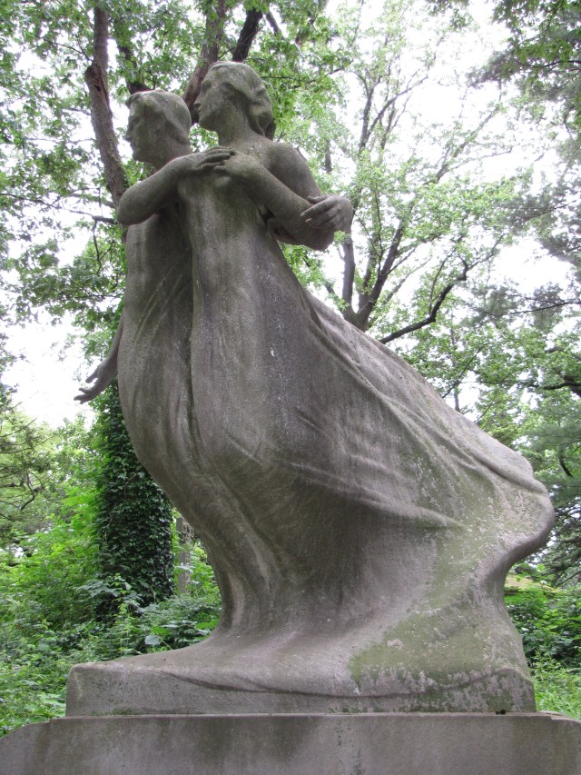 The book, Sylvan Cemetery: Architecture, Art, & Landscape at Woodlawn, described the memorial as “The two figures … of heroic size … symbolical of the soul leaving the body, the … figures are of Faith and Hope. The spirit-forms of a man and a woman, carved by the Piccirilli Brothers from Aitken’s model, stand atop a low curving bench, with spiral forms at each end, suggestive of flowing water. Chiseled on the bench is the quotation, “Our soul has sight of that immortal sea which brought us hither.” Which comes from William Wordsworth’s ode, Imitation of Immortality from Recollections of Early Childhood. In the poem, the lines suggest that our soul can reconnect with the formless, timeless realm from which we arrived as infants, when we were closer to the celestial before engaging the material world.”