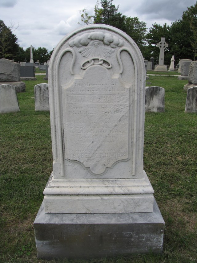 Engraved on the stone is the name Isobel P V. Handy. However, the Congressional Cemetery Index lists her name as Isabel Yelverton Peyton Handy and the following information about her, “On Sunday, February 9, 1902, at 2:36 p.m., Isabel Yelverton Peyton Handy, widow of Edward Graham Handy, daughter of Joseph Walker and Elizabeth Ogilvie Laurie Beck and mother of Dr. Wm. E. Handy and Mrs. Jos. B. Austin. Funeral from her late residence at Hyattsville, Md., Tuesday, February 11, at 12 am. Interment private. [Evening Star, Monday, February 10, 1902, Page 5].”