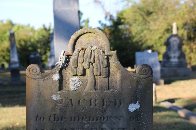 The willow represents a turning away from the harsh symbolism of death found on Puritan gravestones to a softened approach as America moved into the Romantic era. In their groundbreaking article, “Death’s Head, Cherub, Urn and Willow,” James Deetz and Edwin S. Dethlefsen, wrote that the willow first made its appearance in cemeteries in the early 18th century. The motif represented a break from the stark and cold reminders that death would bring that the Puritans carved into their gravestones—flying death’s heads, skulls and crossbones, and gravedigger’s equipment. In addition to the grim reminders of the inevitability of death Puritan gravestones often accompanied the haunting imagery with blunt words such as, “Here lies the body.” Nothing subtle there. The willow and the urn, however, represented a more sentimental view of death. There was a softening of Puritan views during the Great Awakening and the beginning of the Romantic Era. Often the willow motif is accompanied with words like, “In memory of” or “Sacred to the memory of.” This represented a softer approach to the funerary arts.