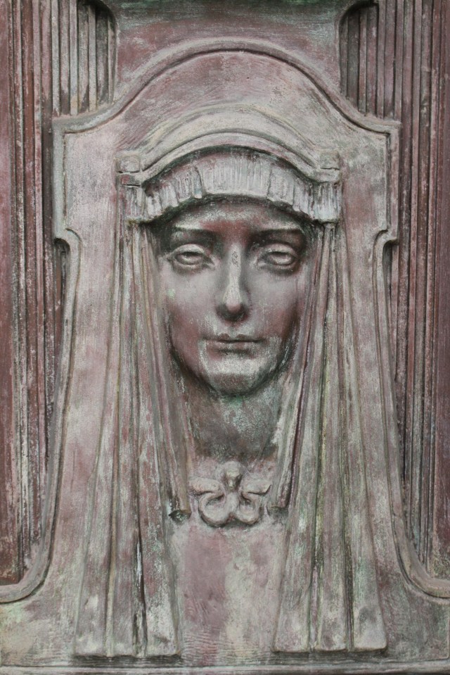 The globe and uroei symbolism is repeated in the amulets around the necks of the sphinxes on the panels on the lower third of the bronze doors leading into the mausoleum. The steps lead up to a pair of bronze doors that feature lotus flowers and buds.