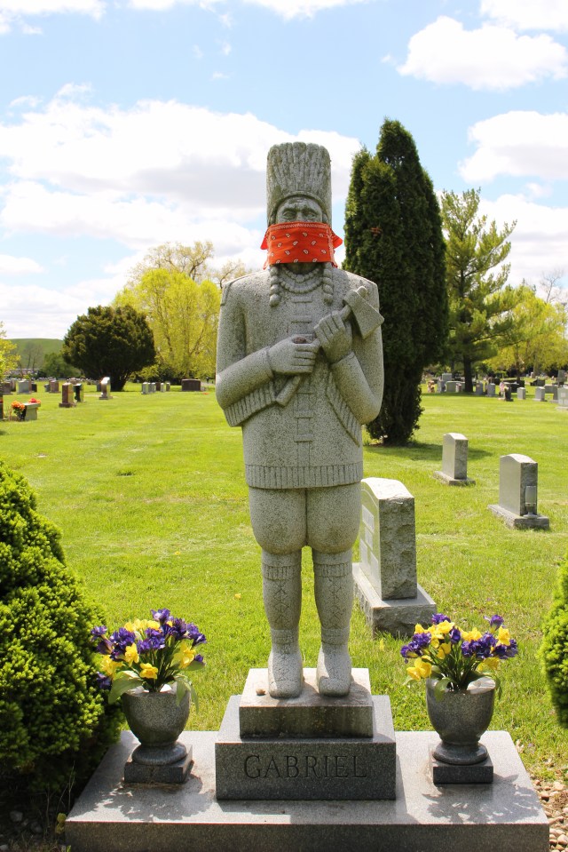 As you drive down the long lane into the cemetery, on the left side is a life-sized sculpture of a Native American, tomahawk and all, marking the Gabriel Family plot. Unfortunately, the day I visited the cemetery, safety practices for COVID-19 had been put in place and the sculpture was wearing a red paisley handkerchief mask—as they say, “Mask-it or Casket”, so I didn’t have a chance to see the full face of the sculpture, which I imagine to be stern and regal. I hope my next trip the cemetery will be after the virus has been wrangled to the ground and stamped out and the face of the sculpture will be revealed in all of its glory!