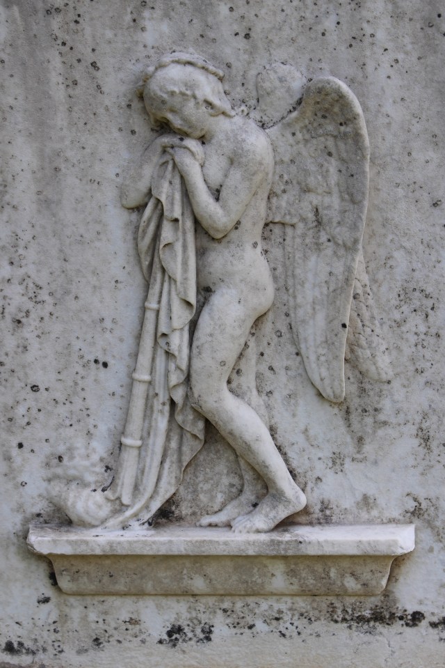 The flame on the gravestone is symbolic of the soul.  The inverted torch represents a life that has been extinguished.  Angels are popular images found in cemeteries throughout the world.  The English word “angel,” is derived from the Greek word “aggelos” meaning messenger or herald.  Here the angel brings the news that a life has been lost.