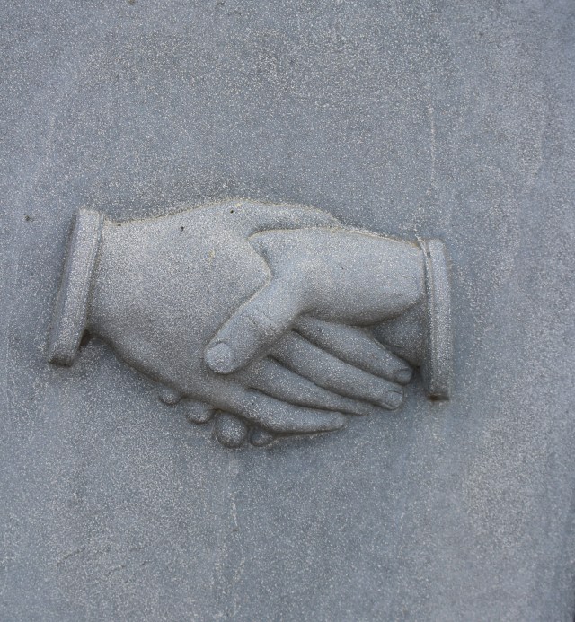 Another common motif found in American cemeteries are—clasping hands. The clasping hands on this gravestone likely represents holy matrimony, symbolizing the holy union between a man and a woman. Often one hand of the motif is clearly the hand of the female, her cuff ruffled, with the hand on the other side depicting a shirt’s cuff barely visible from underneath a suit jacket, though neither hand displays a cuff male or female in this example. Clasping hands can also represent the brotherhood of the union symbolizing the brethren of workers clasped in the making of something together, sharing their labor bonded by common work. Lastly, the motif can also signify a farewell handshake life on earth and the welcome to Heaven, leaving behind what they have known on earth for the sublime pleasures of Heaven.