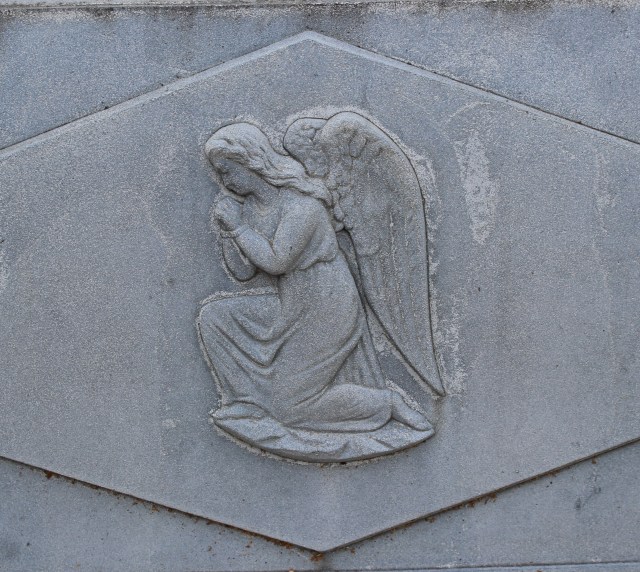 When looking at gravestones, there is always room for interpretation. Elisabeth L. Roark wrote an article about angels titled, “Embodying Immortality: Angels in America’s Rural Garden Cemeteries, 1850—1900”, pages 56 – 111, 2007 edition of Markers, XXIV, in which she categorized the eight most commonly found types of graveyard angels—grouped by the task they performed: soul-bearing; praying; decorating and guarding; pointing; recording; trumpeting; sword-bearing (archangel Michael); and child angels. The winged protectors served to watch over the “soul while living, removed occasions of sin and provided protection when danger threatened, interceded on their charges’ behalf, attended at death, eased the transition to the next world, conducted the soul to Heaven, and looked after the grave site and the deceased’s remains until resurrection.” These were busy angels. In addition to those duties, the praying angels served as an intercessor conveying messages from their charges to Heaven. Though not in this example, these angels are often looking upward toward the Heavens, hands clasped together in prayer, sometimes coupled with emblems of faith, such as, anchors and crosses, often clad in toga-like clothing.