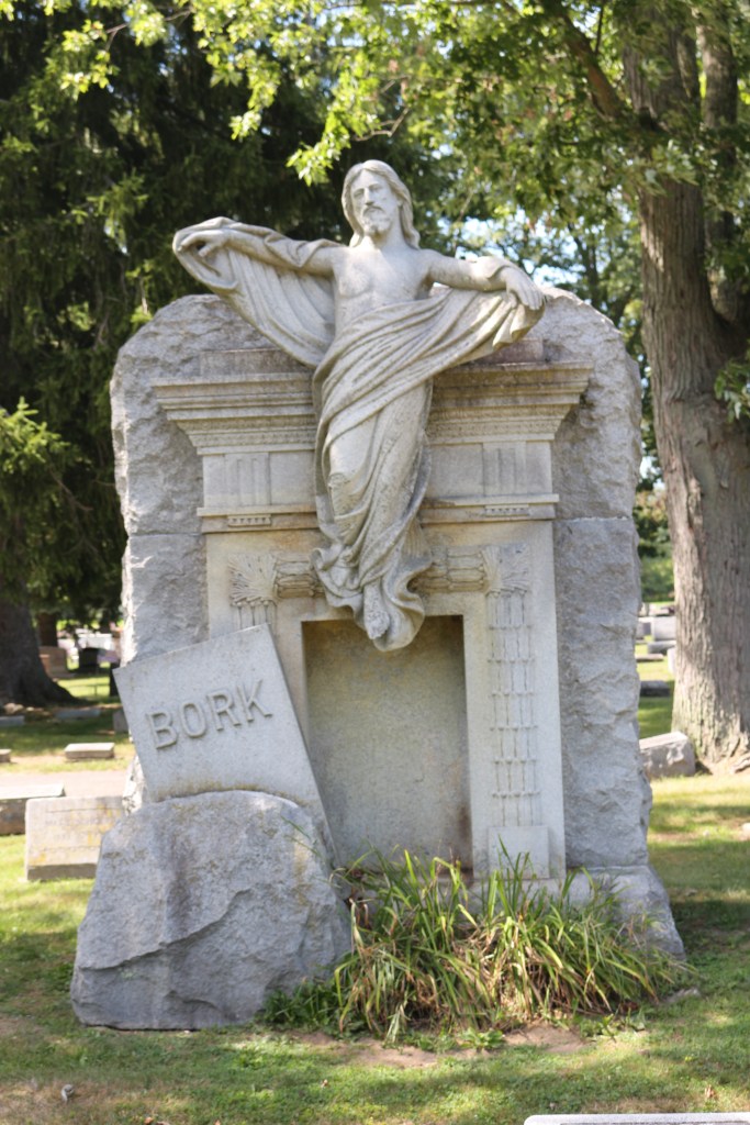 However, the Bork Family monument in St. Joseph’s Cemetery in Tiffin, Ohio, depicts Jesus’s ascension to Heaven. Here Jesus leaves the Earthly realm for the Heavenly realm—this is the Resurrection of Christ.