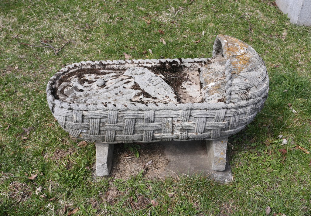 The gray marble gravestone of Jamie Sax, who died just shy of being 6 months old, is an empty bassinet. The intricately carved basket weave is still clear after over 130 years since it was erected. The turned down blanket, the pillow, and the empty bassinet has a simple inscription that says, “JAMIE”. The neighboring family monument gives the details of his birth and death dates.