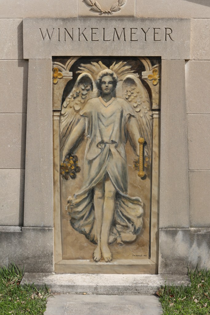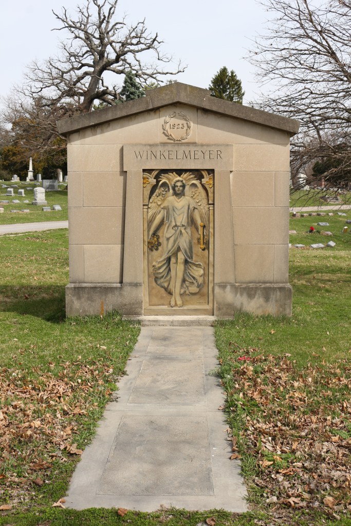 The WINKELMEYER Family Mausoleum depicts and angel and mimics other mausoleum doorways made of sculpted angels or mourning figures.