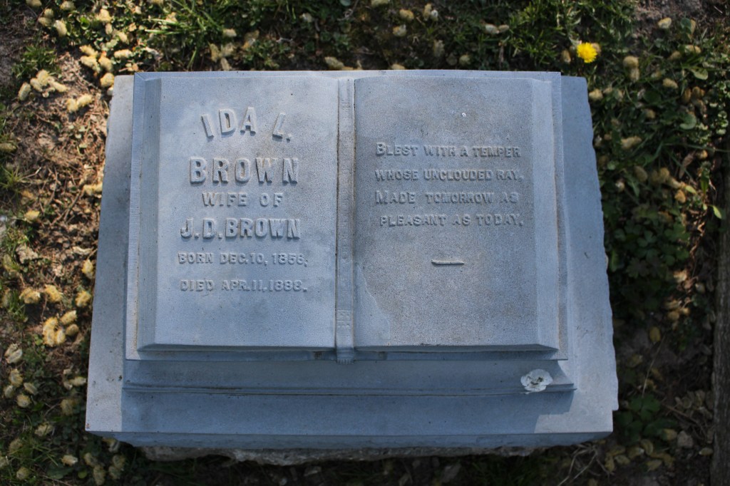 In this example, the marker is in the shape of an open book. The open book is a fairly common symbol found on gravestones. The motif can represent the Book of Life with the names of the just registered on its pages. This book, like any book in a cemetery, can also symbolize the Word of God in the form of the Bible.