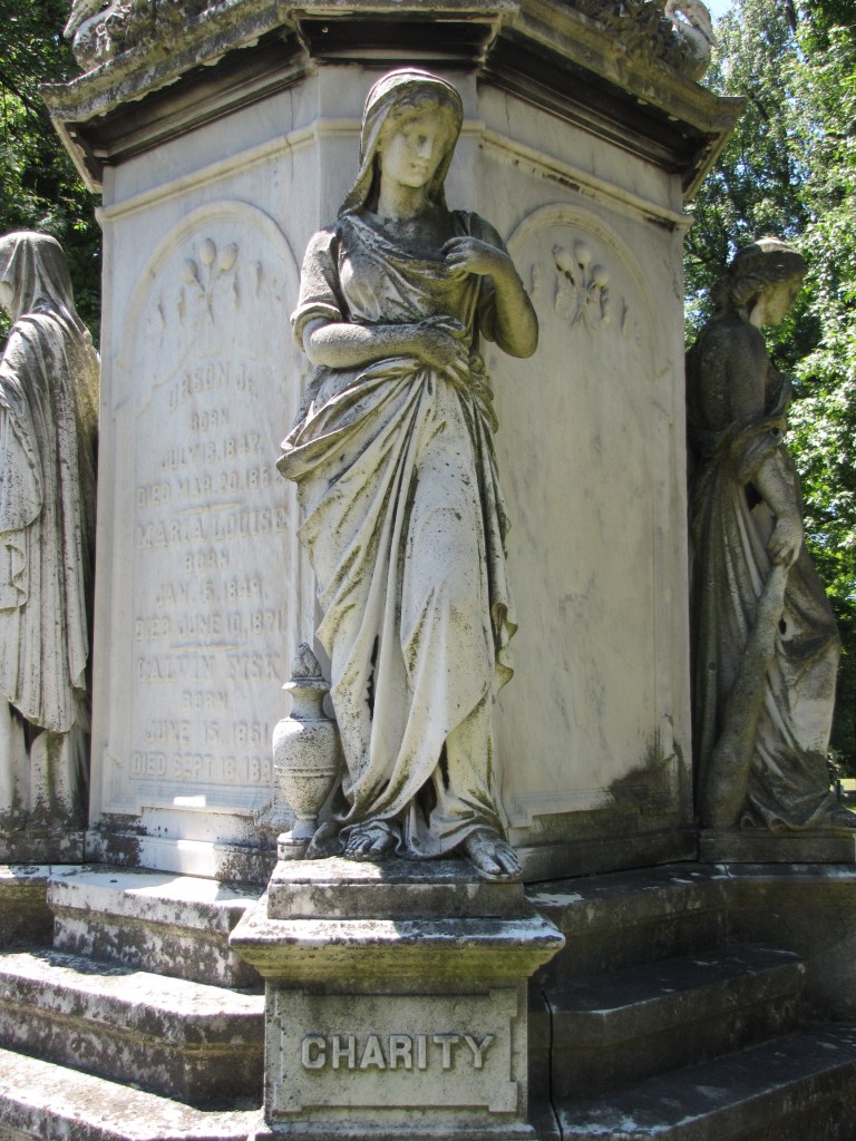 The elaborately decorated white marble Phelps Family Monument in the Forest Lawn Cemetery in Buffalo, New York, is a Victorian confection of design and funerary symbols, sculpted by Nicola Cantalamessa-Papotti (1831?-1910) in Rome in 1876. The monument is topped with the angel Gabriel with pelicans at his feet festooned with garlands of flowers. Above the inscription on the face of the monument is the winged hourglass symbolizing the ephemeral nature of life on Earth and time itself. The memorial features four allegorical figures representing four virtues—Hope, Faith, Charity, and Fortitude. Hope, Faith, and Charity are considered as the theological virtues which have been identified by Christians seeking to live a good and moral life. Fortitude was considered a cardinal virtue by ancient Greek philosophers.