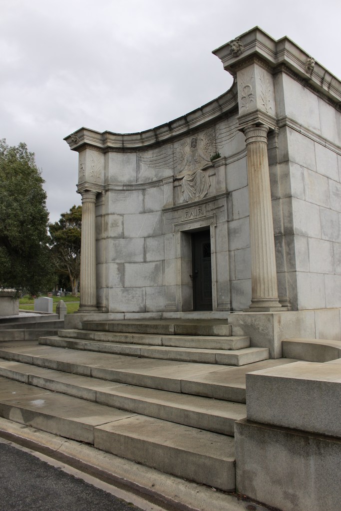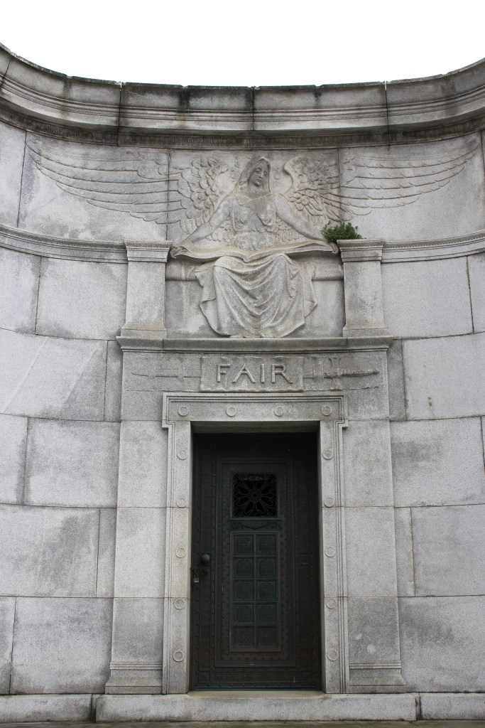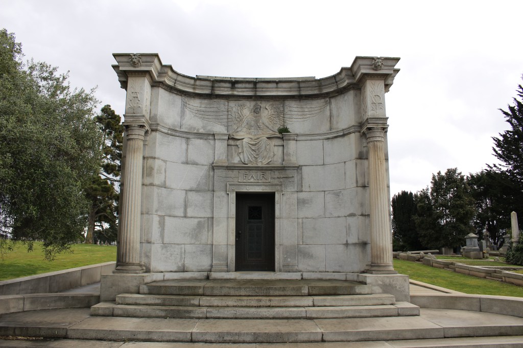 Fair is buried in a towering mausoleum in the Holy Cross Catholic Cemetery at Colma, California. The mausoleum is a masterpiece of eclectic architectural styles. The half circle façade is reminiscent of the Baroque and Rococo, which used rounded shapes to exploit curves for plan forms. The two “wings” of the façade envelope the viewer and are punctuated by modified and decorated Tuscan columns that support an elaborate cornice. The cornice is decorated with lionheads while the friezes above the columns display Greek letters—alpha on the left and omega on the right. Alpha is the first letter of the Greek alphabet and omega is the last—they are respectively the “A” and “Z”. In this case, alpha and omega are a reference to the Biblical passages found in the Book of Revelation, Chapter 1, Verse 8: “I am Alpha and Omega, the beginning and the ending, saith the Lord, which is, and which was, and which is to come, the Almighty”.