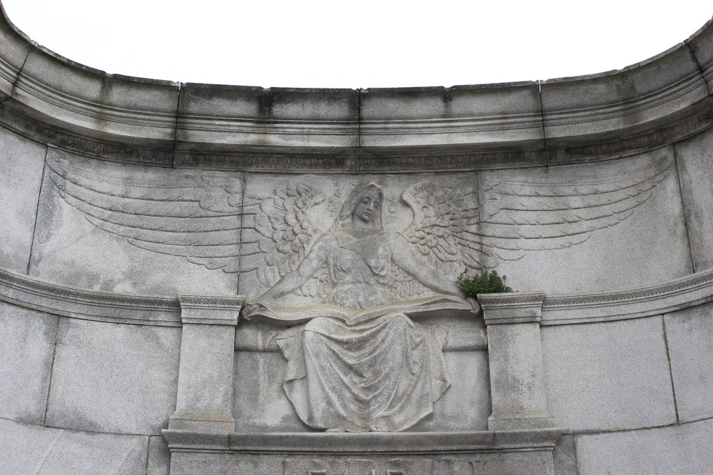 Carved in a low bas-relief above the doorway, is a winged angel. Winged figures in a cemetery are instantly recognize as angels–messengers of God. However, Christian art did not depict angels with wings until the fourth century. Before then, angels were represented in several different forms–sometimes in human form, but also represented as a dove, or even just as a hand reaching down to Earth from the Heavens. Beginning with the reign of Constantine, angels began being depicted with wings, as we commonly portray them today. “Based on the winged Greco-Roman Nike or Victory, their form thus embodied Christianity’s promised triumph over death. Medieval and Renaissance tombs often featured angels that attended images of the deceased.”