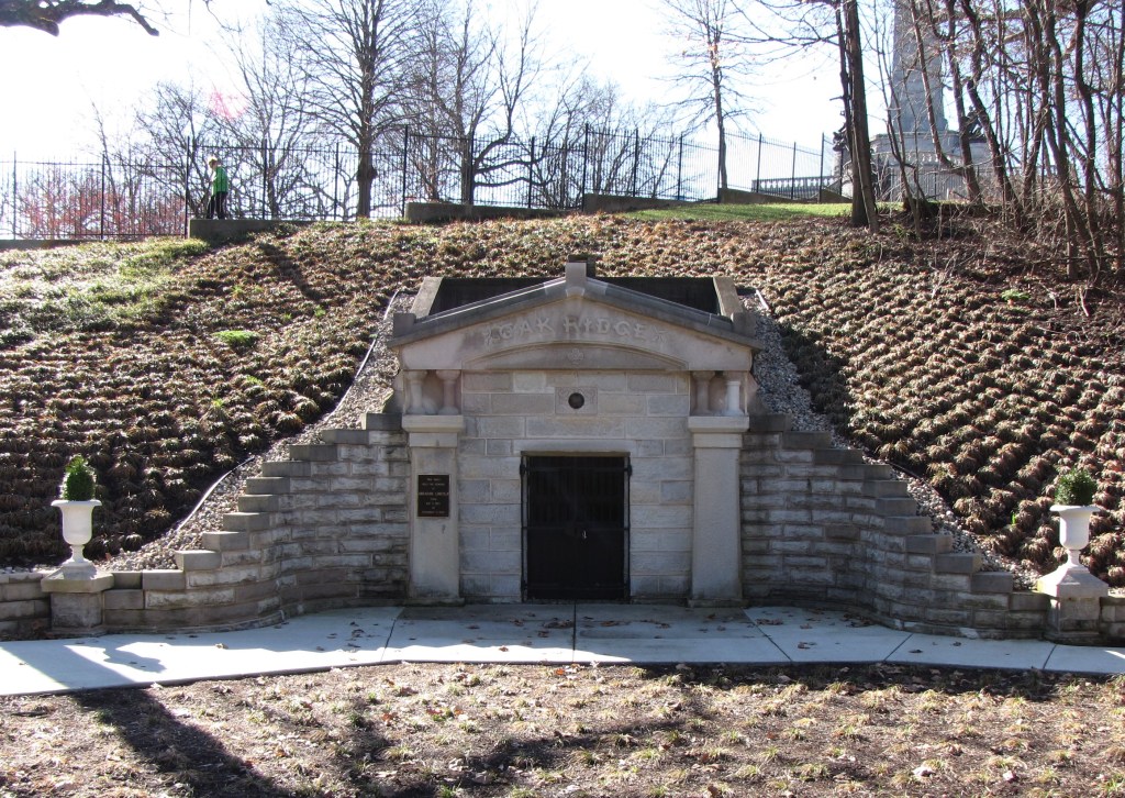 “Built in 1864, this receiving tomb, like those found in many American cemeteries, served “those who in their bereavement are not immediately prepared to site a Lot for the final resting place, also those who are awaiting the arrival of friends.” Oak Ridge remodeled and enlarged the vault in 1891.”