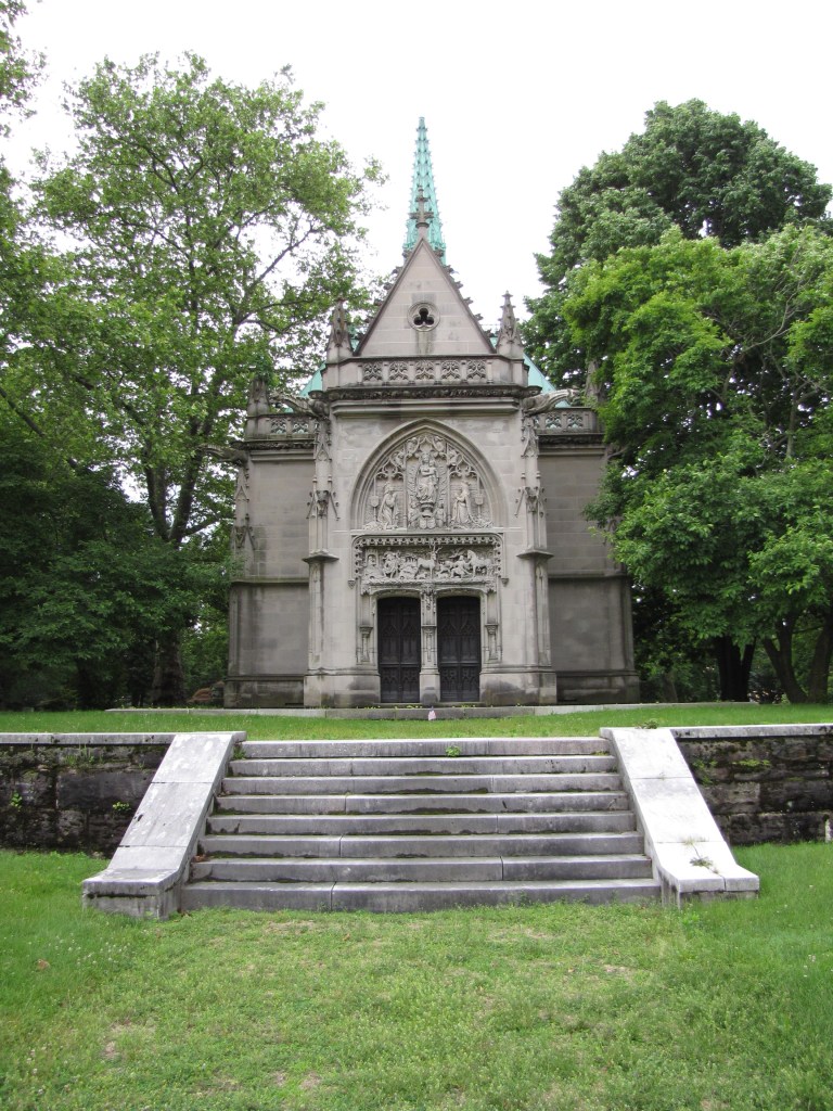 The massive Dexter Family Tomb in the Spring Grove Cemetery in Cincinnat, Ohio has many features of the medieval cathedral from which it was inspired. Typical of Gothic architecture, are the pointed arches which became popular in Western building designs during the 12th Century. Visually the pointed arch is lighter and also allowed builders to create taller windows which gave the buildings an airy feeling. In addition to the visual lightness, the pointed arch was stronger than the rounded arch which was popularized in Romanesque architectural designs. The arches are highly decorated with multiple moldings giving the windows a delicate appearance. In addition to the decorative moldings each arched window has small decorative points projecting from the curves in the arch—this is known as cusping. These are formed using small curves. It is where these small curves meet and form a point or cusp. Lastly, each window has a hood molding that forms at the side of the window and then culminates in the pointed arch. Flanking both sides of the tomb are flying buttresses. These highly decorative arches gave additional support to the walls within a building. The buttresses were positioned at the points of greatest stress and added additional structural support. Each of the flying buttresses are decorated with tall pinnacles which add weight to the buttress. The connecting pieces between the buttresses and the building are referred to as flyers and even those are highly decorated with tracery and quatrefoils.