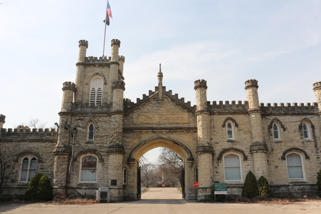 The main gate at the Rosehill Cemetery in Chicago was build in 1864, designed by famed architect William Boyington. The gate is constructed of Joliet limestone in the Castellated Gothic style which is easily identifiable because of the distinctive battlements at the top of the building. The gate, at first glance, looks like an ancient castle—hence the name of the style! The massive square tower and the hexagonal towers that punctuate the building give it power and strength.