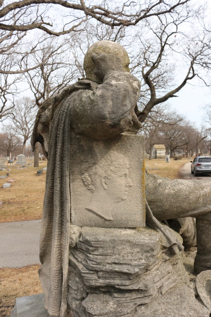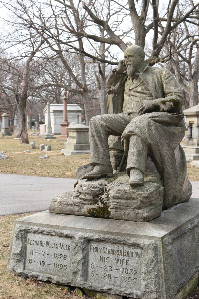Volk designed his own funerary monument which was carried out by the Gast Monument Company.  The sculpture sits on a circular plot in the Rosehill Cemetery in Chicago.  Volk is depicted seated as if he is resting on a rocky ledge.  He leans against a closed book that has a bas-relief profile of a woman—presumably of his wife, Emily. In one hand he is holding a walking stick and by his feet is a tattered hat.
