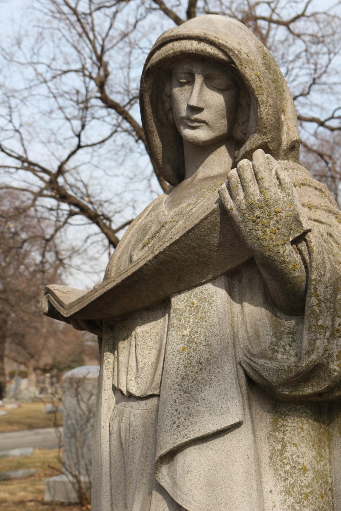 The Shippey Family monument is a sculpture of a hooded female figure holding a scroll. The scroll represents both the life of the deceased and the time spent on Earth. Like so much symbolism found in the cemetery, the scroll can have many meanings. The scroll likely represents the life of the deceased that has come to an end and been recorded by the angels.