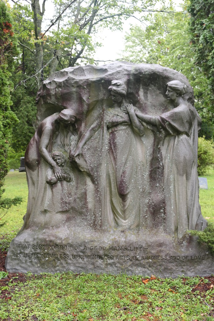 It further stated, “Mrs. Esther C. Diggins, widow of the late Delos F. Diggins, of the Cummer-Diggins Company, Cadillac, Mich., has recently caused to be created a handsome memorial to her late husband in the cemetery at Cadillac.  The monument is made from a special design by Miss Nellie Walker, who was a student of Lorado Taft, and who is now associated with him in sculptural work.  The memorial is cut from a solid block of Westerly granite: is 9 feet high, 9 feet wide, and 4 feet thick.  The block weighs 42,000 pounds and was furnished by Charles G. Blake & Co., of Chicago, at whose establishment the work of the sculptress was done.  On the base of the column is chiseled this statement, “That Best Portion of a Good Man’s Life—His Little, Nameless Unremembered Acts of Kindness and Love.””