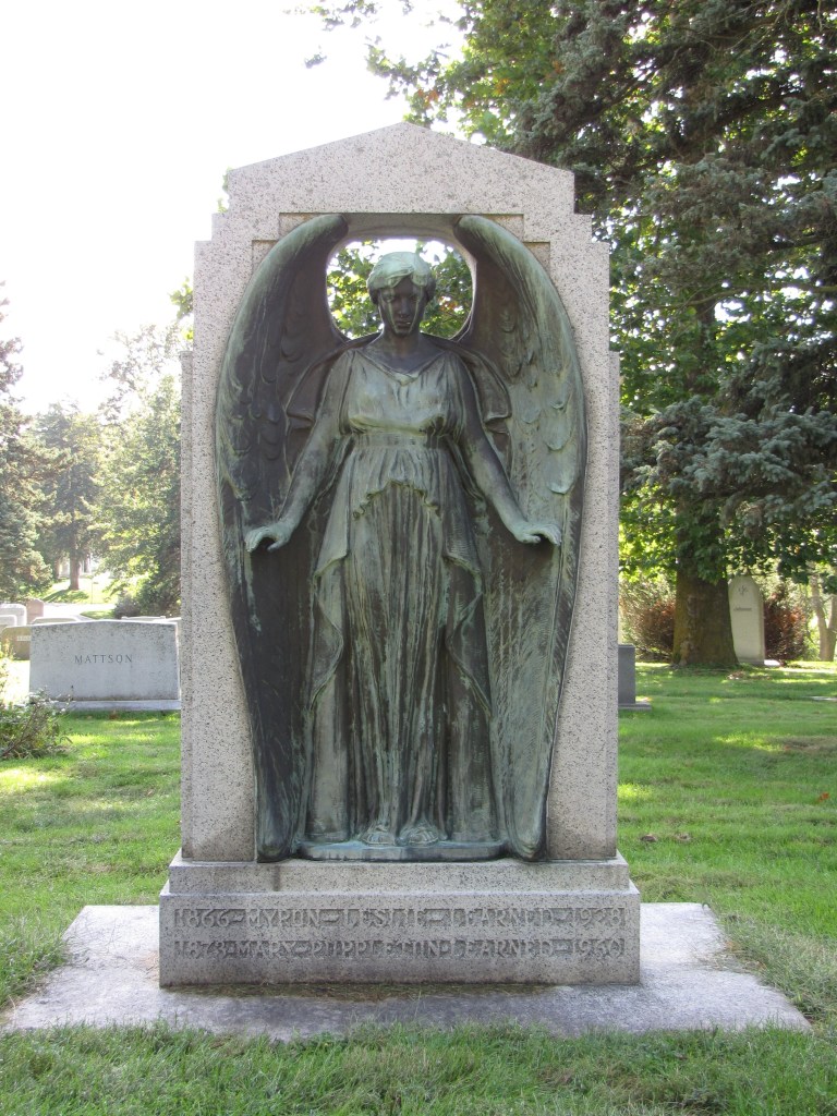 After the death of Mr. Myron Learned in 1928, his family commissioned Nellie V. Walker to create the angel to mark his grave in the Forest Lawn Cemetery in Omaha, Nebraska. The art deco design, completely in 1929, is evident in the lettering on the base of the monument. The angel recedes into a plain unadorned granite surround. The oval behind the angels head gives the grieving angel a halo effect. The angle’s outstretched arms indicate a protective posture. The water stains from the angle’s eyes give the statue an appearance that she has been weeping.