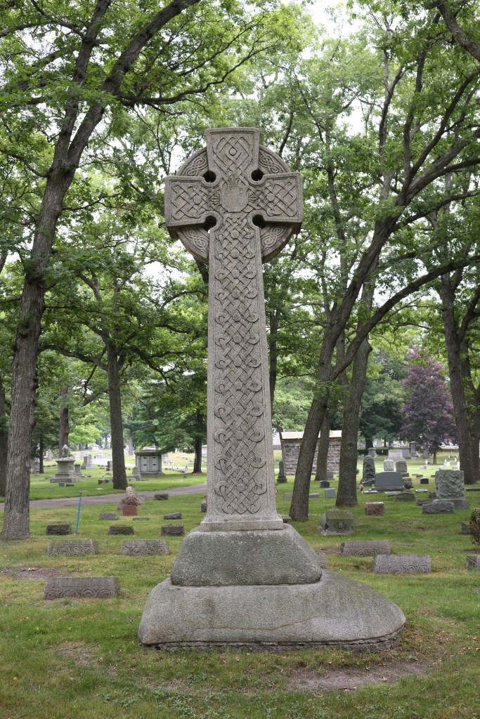 After his death, the Butterfield family erected a Celtic cross to commemorate the family’s burial plot. The Celtic cross is one of the most easily identified and plentiful crosses found in American cemeteries. The Celtic cross is much like the Latin cross with a long stem and crossbeams toward the top third. But the feature that distinguishes it from other crosses is the circle, called a nimbus, that encompasses the intersection of the crossbeams.