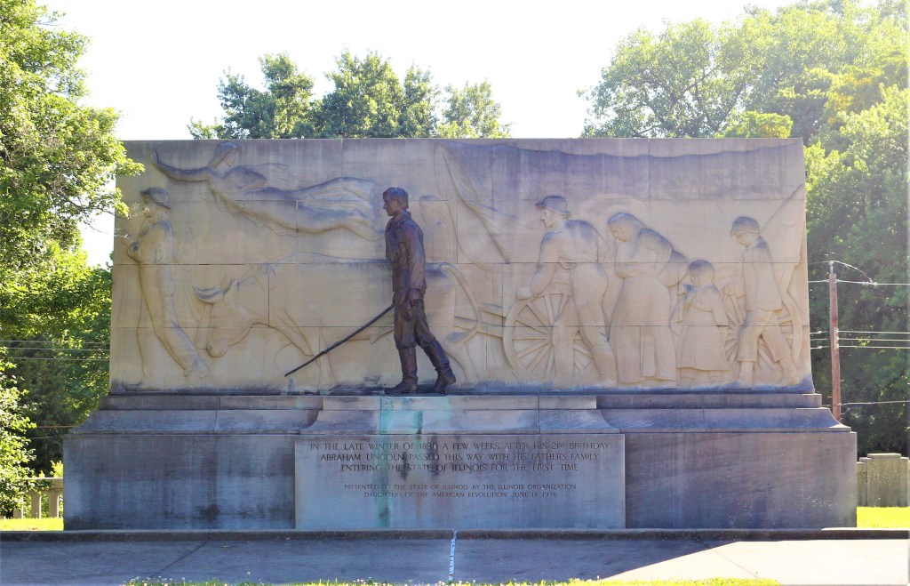 A limestone panel of the monument depicts the Lincoln family entering the state. Lincoln at 21 is represented in bronze walking with his family. Nellie Walker of Chicago designed and executed the monument.”