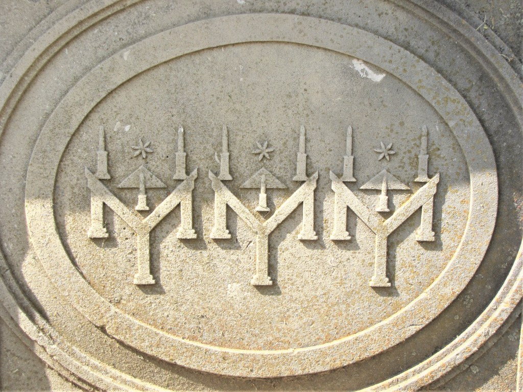Another panel adjacent panel “contains three six-pointed stars (hexalpha) above a crescent. In ancient Masonry, the hexalpha was considered the Seal of Solomon and Shield of David, and it represented the universe, sun, and the planets.”