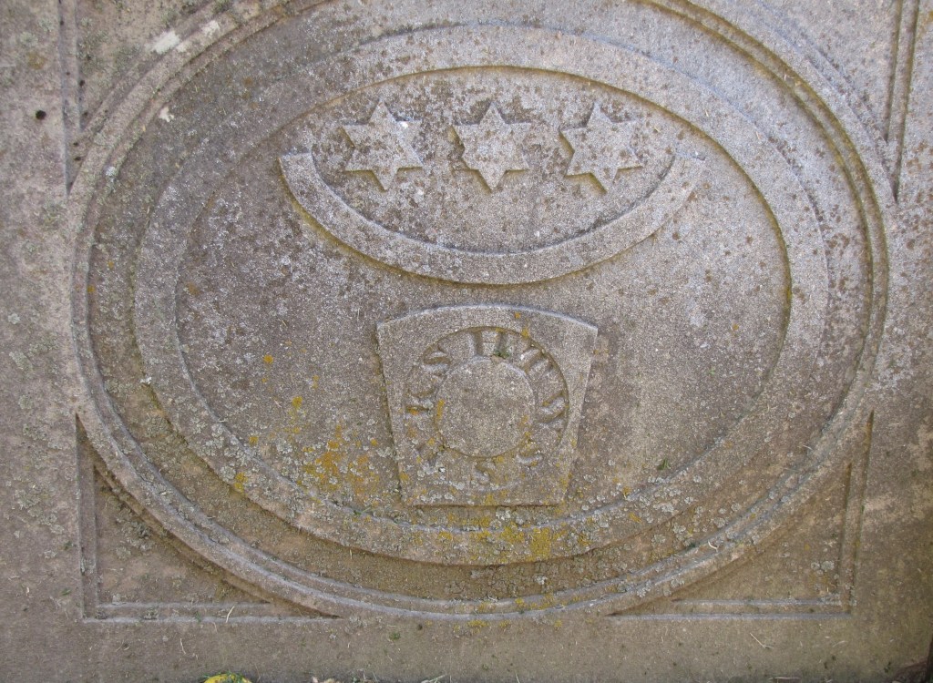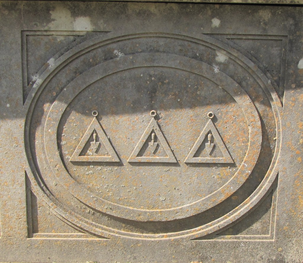 “One end panel of Alderson’s tomb has a quarter moon crescent enclosed by the square and compasses, a symbol seen in jewels of the Junior Deacon and Deputy Master offices. The other end has a blank panel, symbolically facing north, the direction Masons consider a place of darkness.”