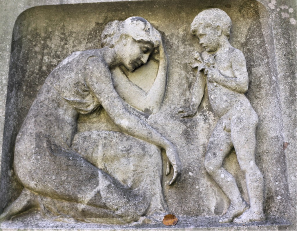 His grave is in a corner of the cemetery far away from the main gate. His monument backs up to the brick wall that encompasses the cemetery. The bas-relief depicts a young boy clutching to what appears to be a rose and bud as he stands before a woman whose head is bent.