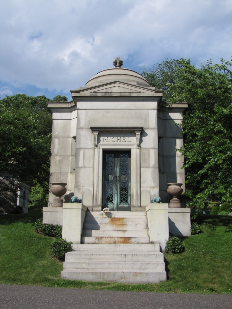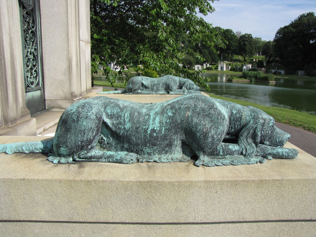 Two bronze dogs flank the steps to the massive granite Michel Mausoleum in the Green-Wood Cemetery in Brooklyn, New York. Though the dogs are laying down, their heads are slightly raised as if they are ready to jump into action.