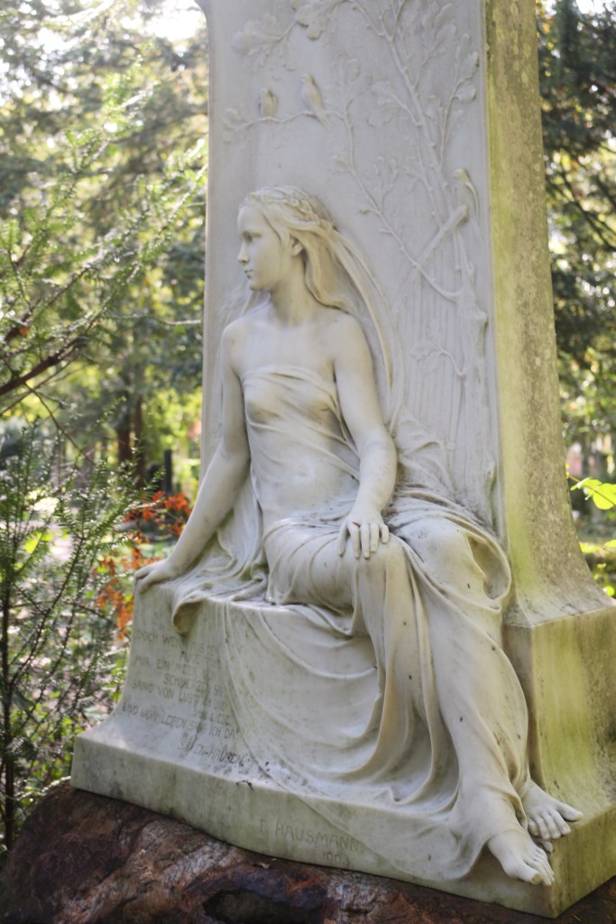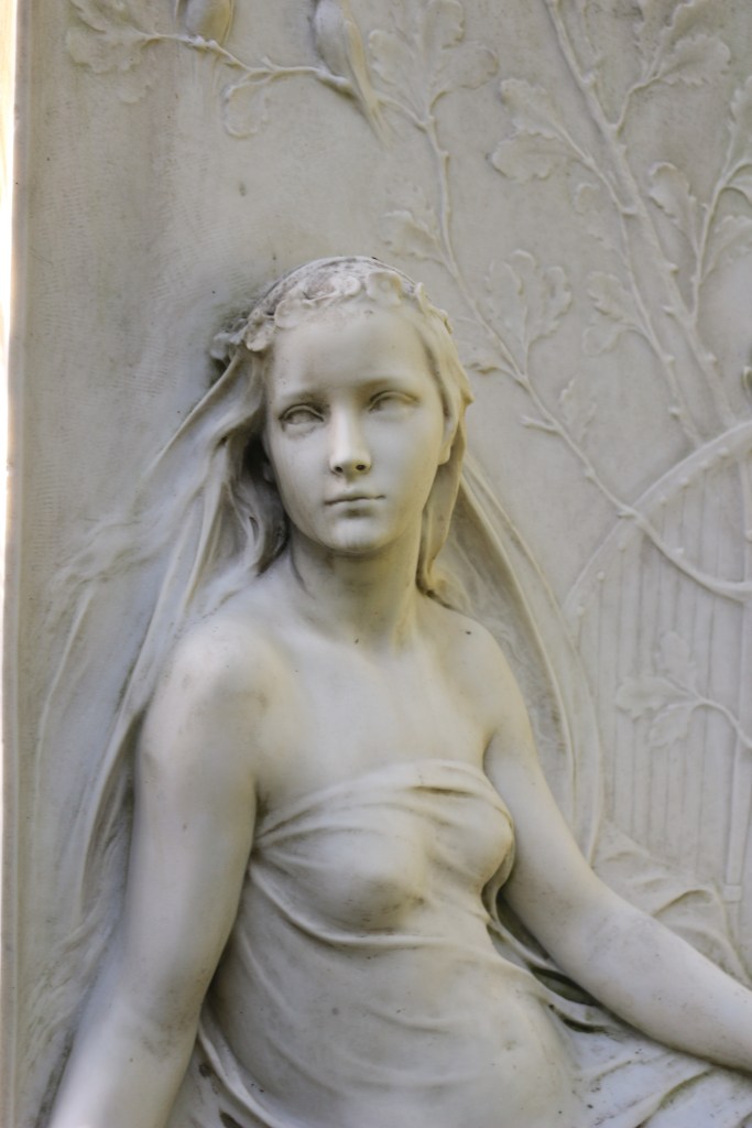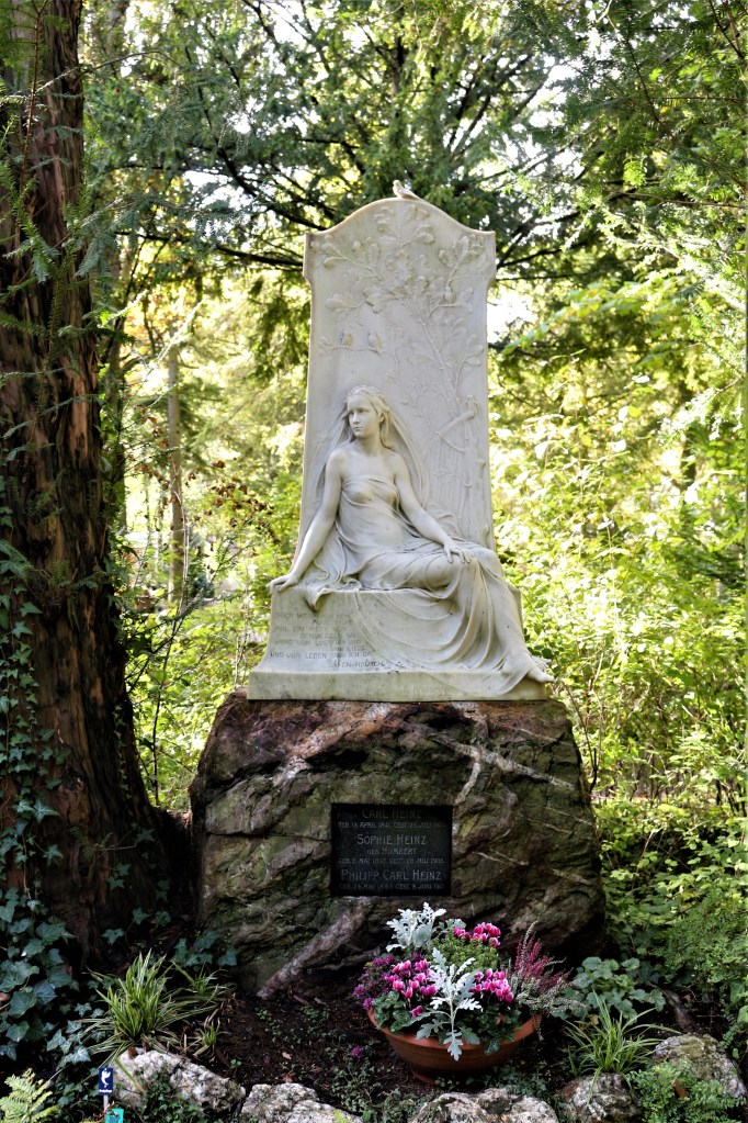 In 1902, Austrian sculptor, Friedrich Christoph Hausmann (June 23, 1860—October 23, 1936) created the delicately-carved white marble Heinz monument in Frankfurt Hauptfriedhof. The monument depicts a young woman draped in a diaphanous wrap wearing a flower diadem and sitting under what appears to be a budding oak tree. Birds perch overhead.