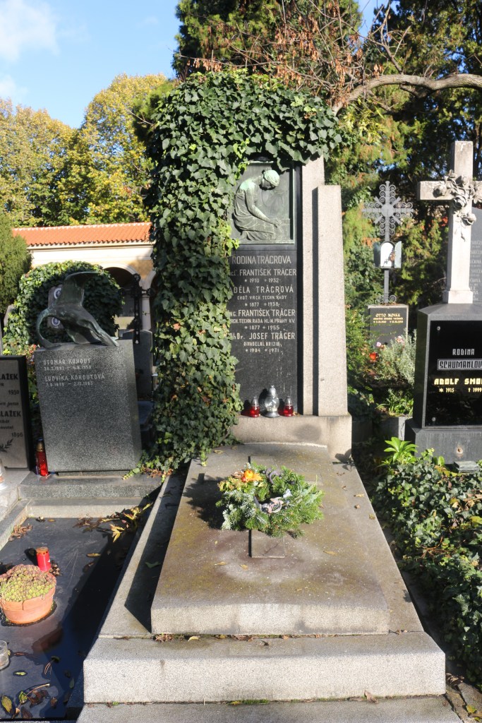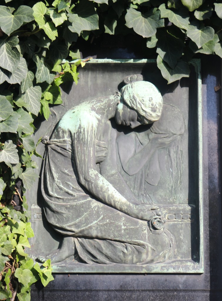 In this example from the Vysehrad Cemetery in Prague, the Tragrova family monument depicts two views of a mourning figure in the bas-relief bronze sculpture on the face of the monument. In the background the mourning figure is depicted with her hands holding her head, stricken with grief and is the third type of mourning figure Robinson mentions. The figure in the foreground is shown kneeling with her head bowed and appears to be resigned to accept the loss. She holds a rose, possibly as an offering for the grave. The act of placing the flower is also a recurring funerary motif which is designed to remind the viewer that life is short. The Victorian funerary symbolism associated with flowers used the rose to represent the love. It also symbolized the messianic hope that Christ would return.